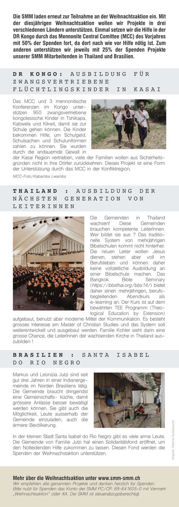 Für 2021 schlagen wir weiterhin die Covid-19-Aktion des MCC (Mennonitisches Zentralkomitee) und andererseits die Unterstützung eines Projekts unserer Mitarbeitenden in Brasilien vor. Wir empfehlen beide Projekte eurer Grosszügigkeit.Hier den Flyer für die Aktion : WEB_DE_SMM_Action de Noël 2021